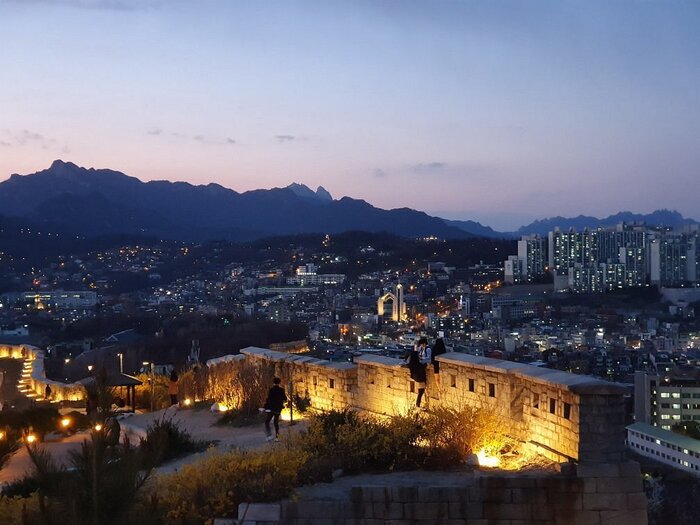 혜화역 2번 출구에서 중앙광장 쪽으로 걸어가다 보면 낙산공원 입구가 등장합니다. 이곳은 노을로 붉게 물들 때부터 아름다워지며 공원을 둘러싼 성곽의 은은한 조명과 달빛으로 낭만적인 분위기가 흐릅니다.