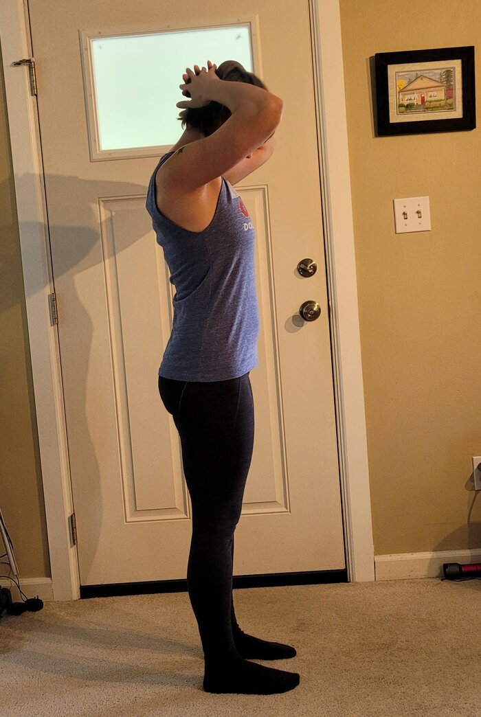 편하게 서서 양손으로 뒷머리를 감싸줍니다.